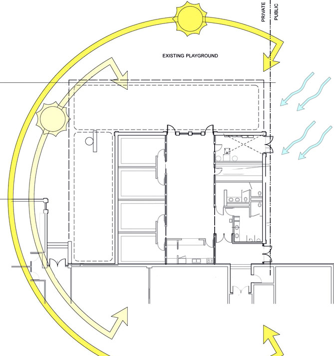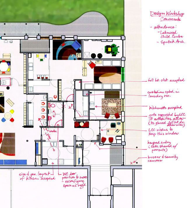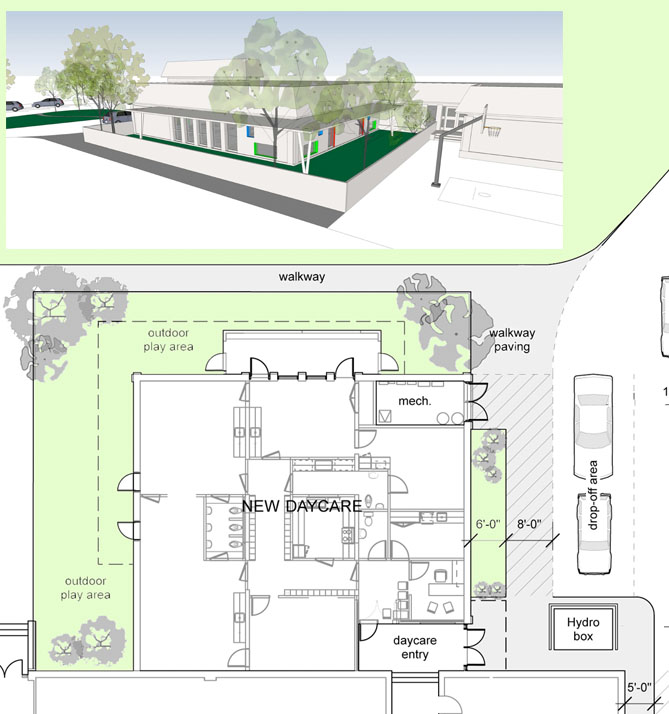 The Lakewood project involves renovating a portion of underused space in an existing school to accommodate a daycare facility. Our proposal called for an improved pick-up and drop off area, easily accessible and sheltered outdoor play areas, a central kitchen, bathroom facilities and a staff area. The plan ultimately provides space for eight infants and twenty-four toddlers in accordance with current legislated Manitoba space requirements. Window placement and room layouts were based on sun paths, prevailing wind direction and clear sight lines to offer a pleasant and safe environment staff and young people.
