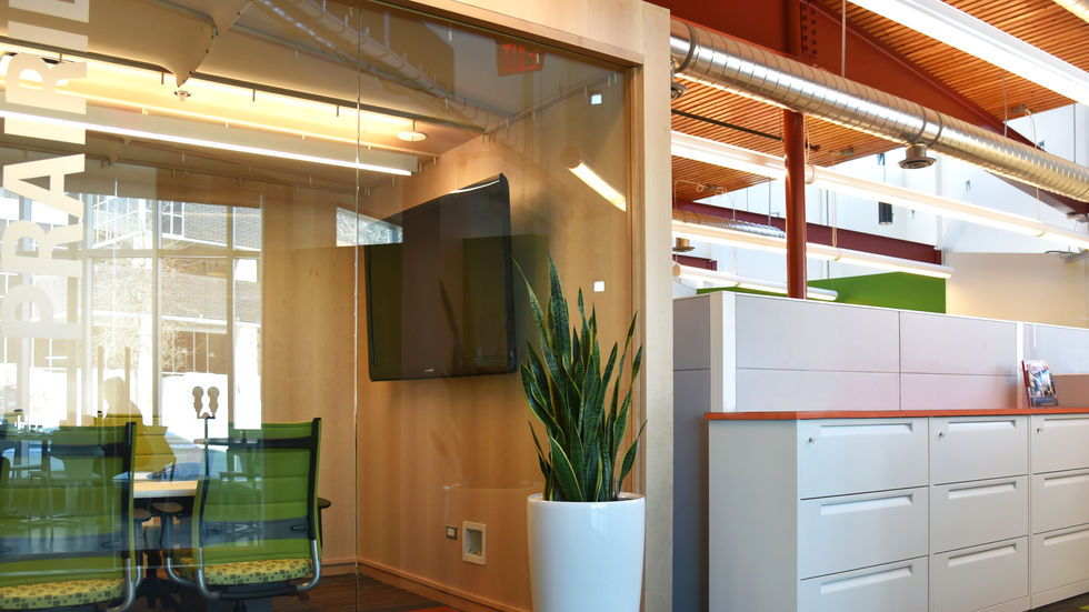 The newly added fully accessible mezzanine, and main floor area, allow for the incorporation of private offices and work spaces that serve the staff of Travel Manitoba within the existing building shell. A great deal of attention was given to the aesthetic quality of the work space on both levels, by highlighting existing heavy timber structure and repeating this feature with laminated structural wood decking for the mezzanine floor, as well as the use of local wood species throughout the space. Custom fabricated steel panels were used to create the guardrail and stairs, and many of these powder coated panels include perforations that offer impressions of Manitoba.